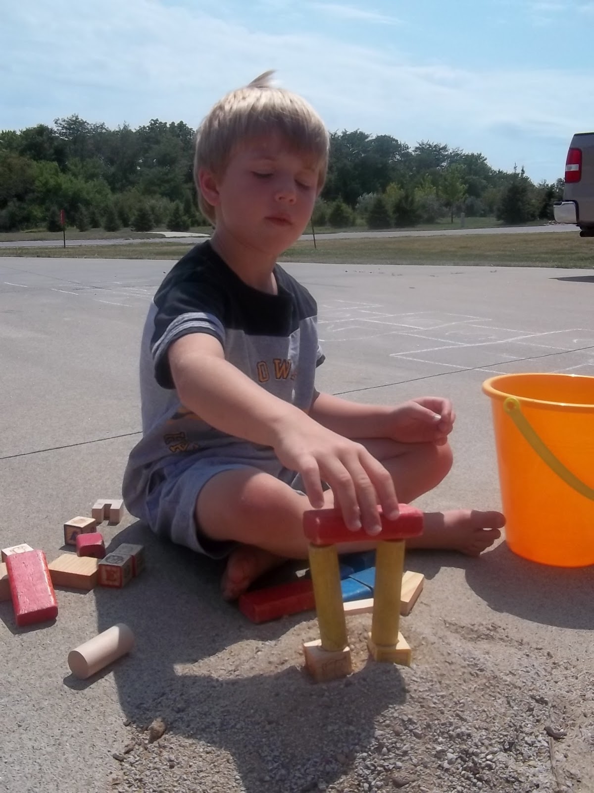 We scooped a bucket of sand from our sandbox and poured it on the cement. Then each child received a handful of wooden blocks for building.