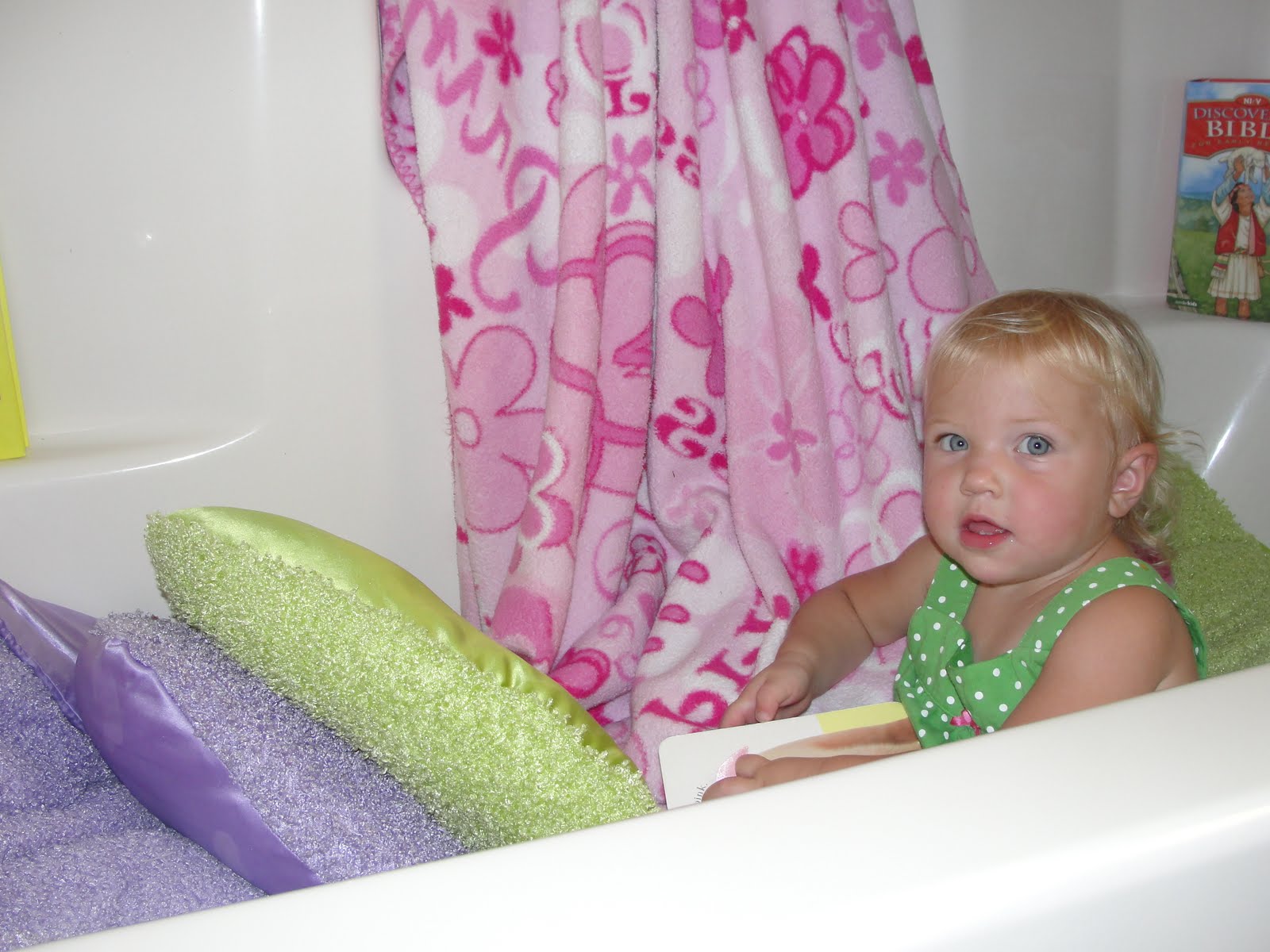 Maggie read her Bible story picture books and tried to shampoo her hair (you can learn from my mistake and remove all the soaps and shampoos BEFORE your children take a soak!)