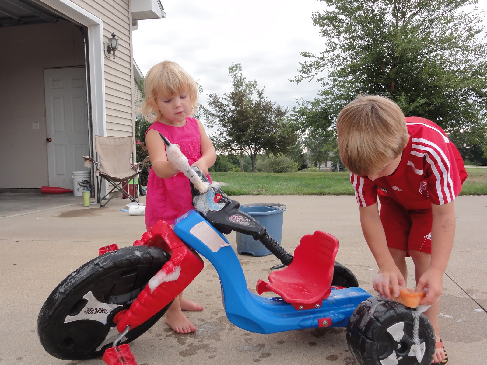 Give them a bucket of soap and water and let them wash their bikes as you wash the car.